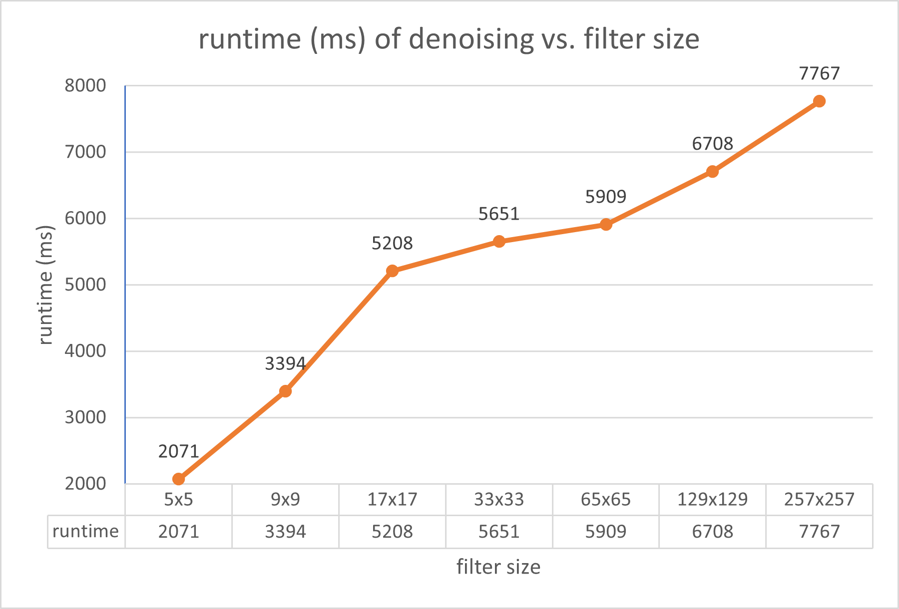 We can see from the denoise results of different filter sizes, that images tend to become more smooth and the colors tend to be more uniform. Less noise persists in images with larger filter sizes. This result is anticipated since as the size of filter increases, the weighted color summation tend to take remote pixels into consideration, and the more iterations, the more uniform the color will be. We can also see that when the size passes 65x65, the effect of more denoise iterations becomes negligible. Therefore, a suitable filter size like 65x65 or 129x129 can be taken to achieve optimum result. More iterations are not recommended as they introduce additional overhead while providing limited improvment over what is already a smooth image.